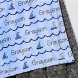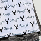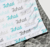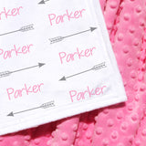 Example photo shows the name Maxwell in White with White arrows on a Granite background and Saltwater minky.